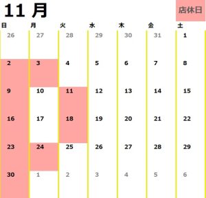 NEWS 新着情報 TOP 新着情報 お知らせ 11月の定休日のご案内 11月の定休日のご案内 お知らせ 2025.11.06 11月の定休日のご案内です。 営業時間は 9:30~18:00 となります。 鈑金塗装、ボディコーティングのご予約、お問合せお待ちしております。