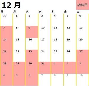 NEWS 新着情報 TOP 新着情報 お知らせ 12月の定休日のご案内 12月の定休日のご案内 お知らせ 2025.11.28 12月の定休日のご案内です。 営業時間は 9:30~18:00 となります。 鈑金塗装、ボディコーティングのご予約、お問合せお待ちしております。